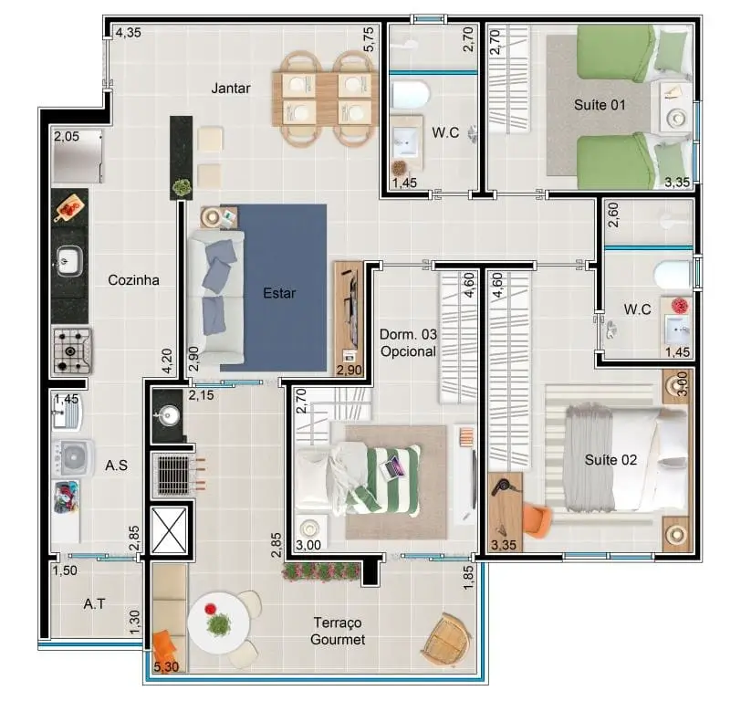 - Acabamento de alto padrão com porcelanato de qualidade superior nas unidades-tipo e nas áreas comuns